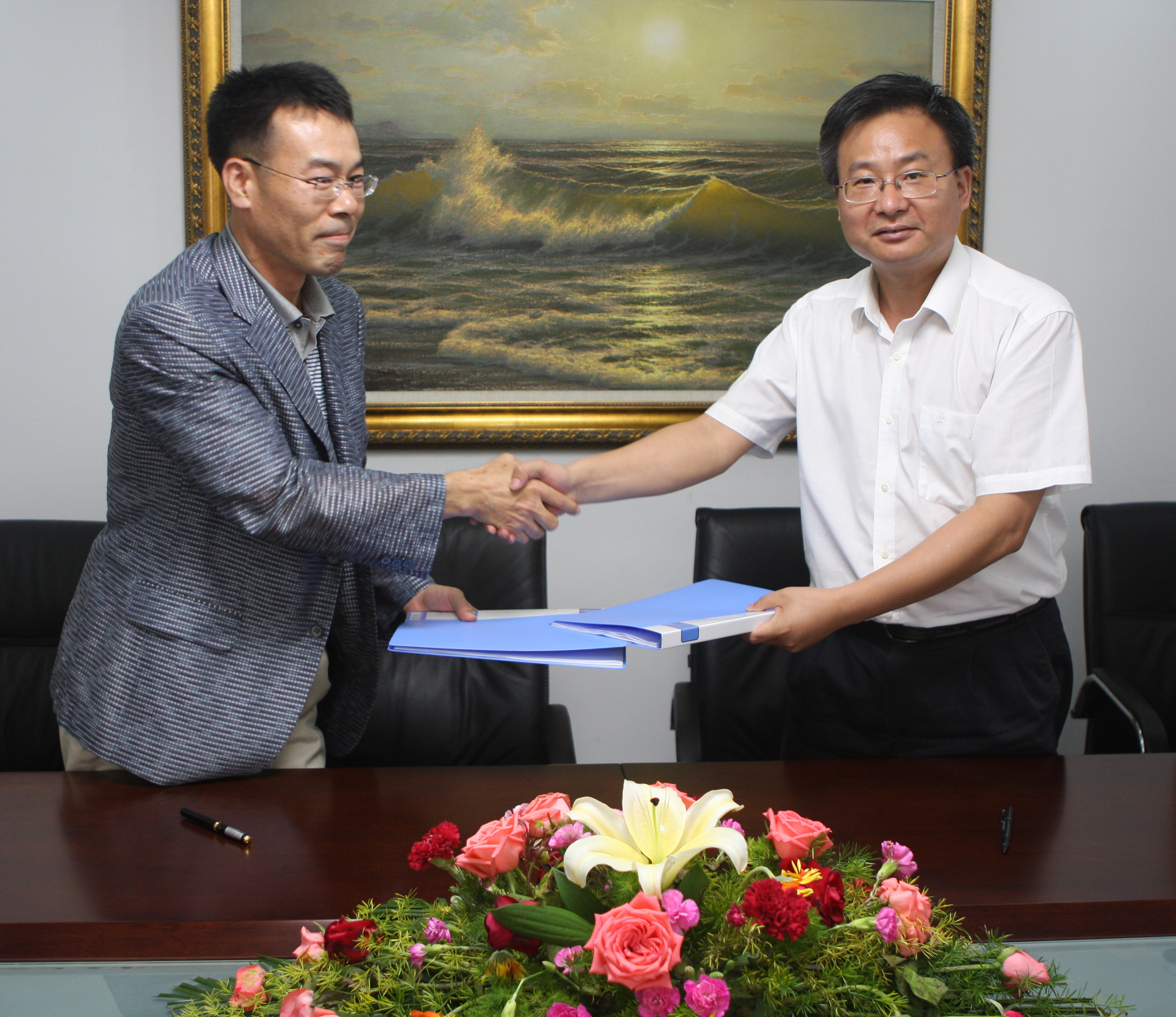 图为仇天青总裁(右)与韩国巨世领建设董事长朴弘济(左)签字后握手